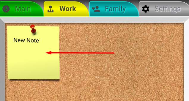 First of all, you see several office cork boards with notes pinned to them. Each board is a separate section, allowing you to easily organize your notes by topic. You can navigate between boards by simply swiping left and right or by tapping the colored headings.