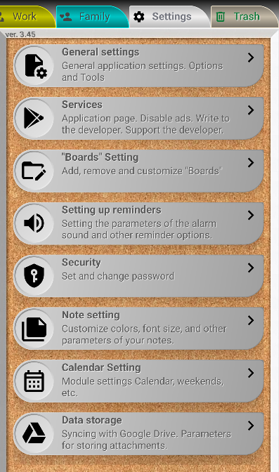 The list of sections isn't limited to the ones you see: "Main," "Work," and "Family." These boards are just examples to give you a starting point. Later, you can add as many of your own boards as you like, and even make them with a different background if you don't like the colorful cork background. You can read more about this in the "«Boards» Setting" section.