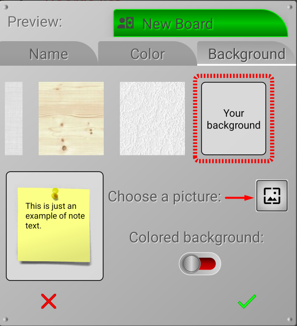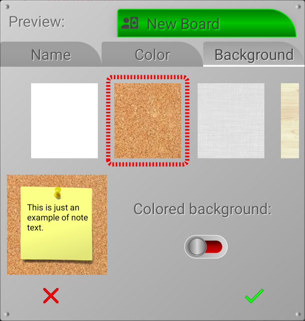 If you're not satisfied with the cork background of your boards, you can choose a background for each board. The app offers several background options. You can scroll through them from right to left and choose the one you like best. The background you choose will be surrounded by a red border.