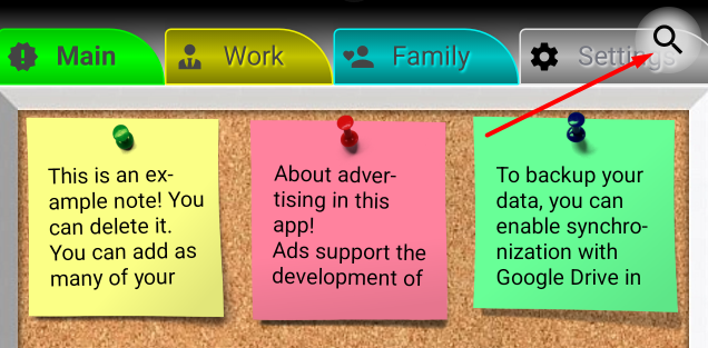 The app has a search system that allows you to find notes by keywords. If you enable this option, a Search button will appear in the upper right corner of the screen.