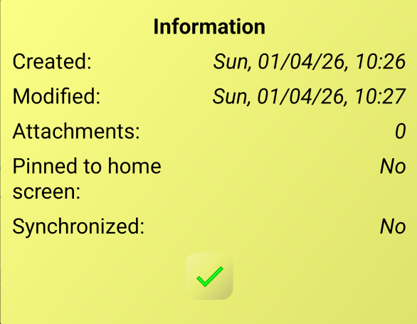 2. Clicking this button opens the "Info" window with general information about the note. This includes the creation time, the last time the note was last modified, the presence of attachments, whether the note is pinned to the home screen, and whether it syncs with Google Drive. You can read more about these parameters in the relevant sections of this Documentation. Each time you edit, a new date and time of changes is set. On the screen, it looks like this: