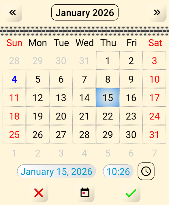Select the desired date and click the green checkmark to link the note to that date. If necessary, you can press the button with the clock image and set not only the date, but also the time. You can read more about working with the Calendar in the "Calendar" section. If a note is linked to Calendar, the button becomes larger and displays the date and time to which the note is linked.