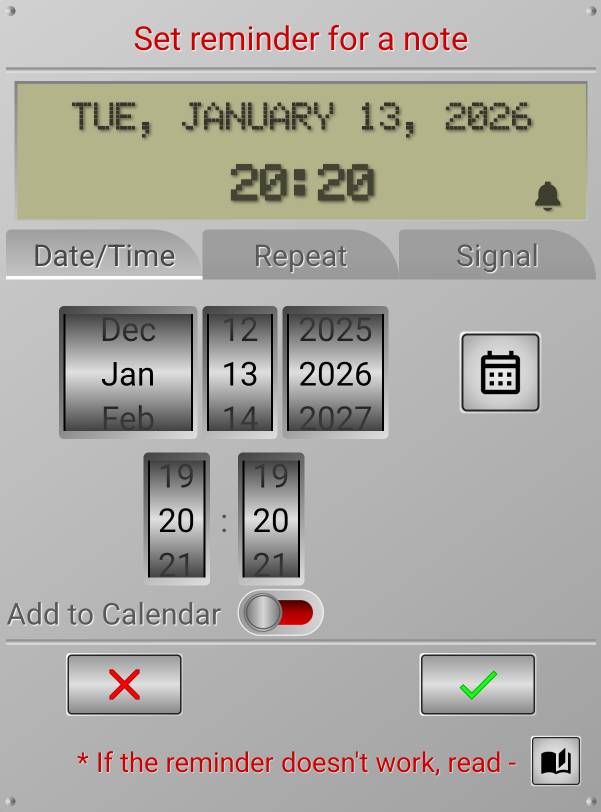 The set date and time are displayed on the display at the top of the window. When selecting a date, you can use the calendar by pressing the button to the right of the date selection wheels. After that, you can click on the green checkmark to set a reminder.