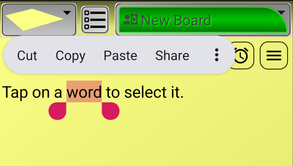 To copy, cut, paste, and perform other similar functions, you can use the standard Android text menu. To make it appear, tap on the desired word in the text, hold it for a while and release. You will see a pop-up menu: