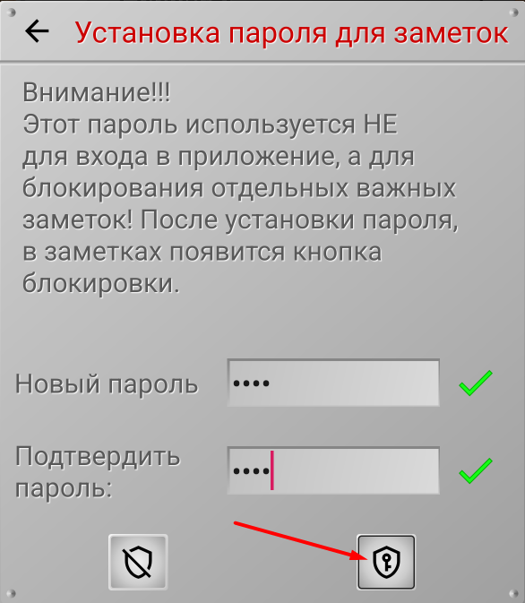 В поле «Новый пароль» введите ваш пароль для заметок, и введите тот же пароль в поле «Подтвердить пароль». Длина пароля должна быть не меньше четырех символов. Если пароли совпадают, то кнопка сохранения пароля становится активна.