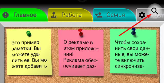 В приложении есть система поиска, с помощью которой вы сможете находить нужные заметки по ключевым словам. Если вы включите эту опцию, в правом верхнем углу экрана появится кнопка Поиска.