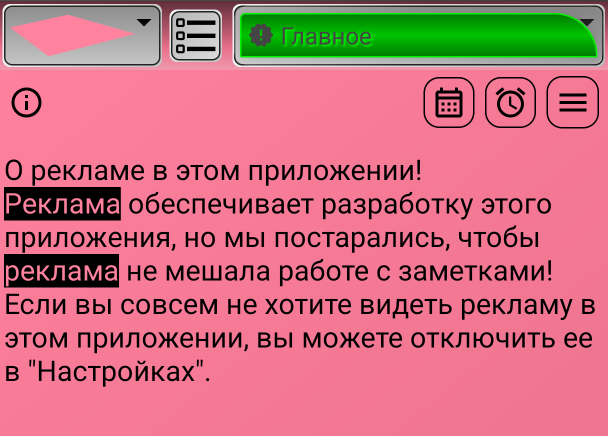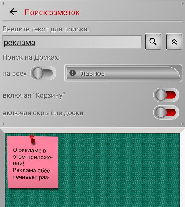 Введите в поисковую строку текст для поиска и нажмите кнопку поиска (с изображением увеличительного стекла). Например, мы ввели слово «реклама». Ниже, отобразятся все заметки, в которых встречается слово «реклама». Если вы откроете такую заметку, то увидите, что искомое слово будет выделено в тексте.