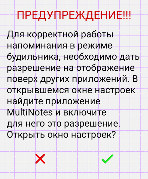 Это разрешение необходимо, так как один из режимов напоминания, это отправка уведомления. Другой режим напоминания, это будильник, и он для того, чтобы он мог сработать в любое время, нужно дать приложению разрешение на работу поверх других приложений.