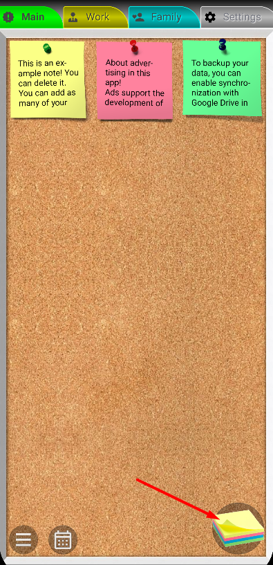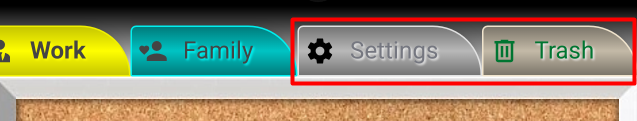The list of sections isn't limited to the ones you see: "Main," "Work," and "Family." These boards are just examples to give you a starting point. Later, you can add as many of your own boards as you like, and even make them with a different background if you don't like the colorful cork background. You can read more about this in the "«Boards» Setting" section.