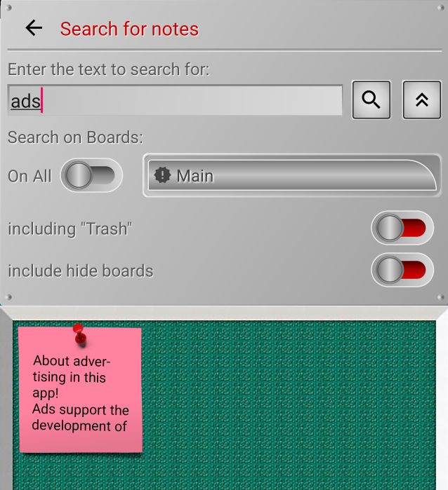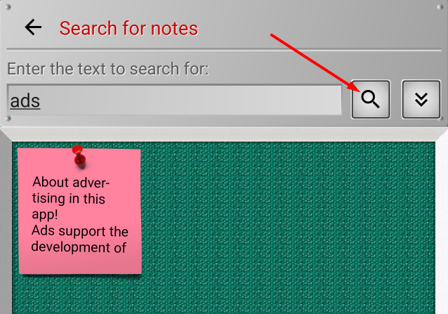 Enter your search text in the search bar and click the search button (with the magnifying glass icon). For example, we entered the word "ads". All notes containing the word "ads" will be displayed below. If you open such a note, you will see that the word you are looking for will be highlighted in the text.
