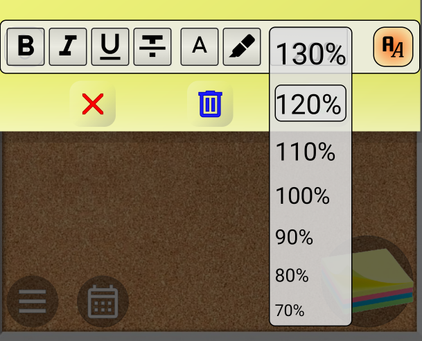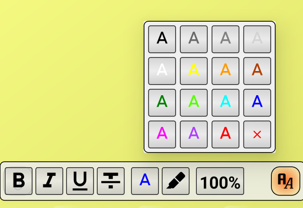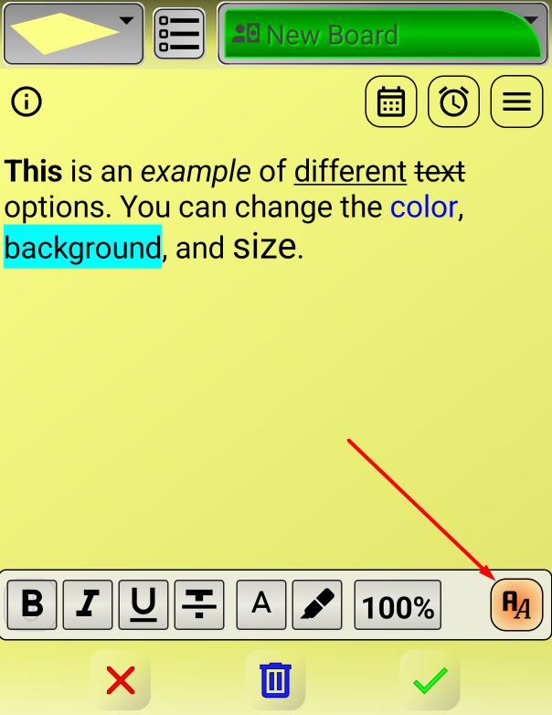 The first button changes the note font to bold, the second to italic, the third to underline, and the fourth to strikethrough. When you activate these buttons, they change color.