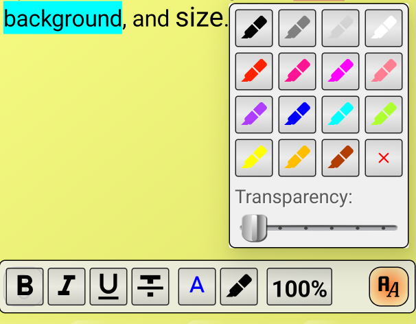 You can change the appearance of the font in your note. You can change the font type (bold, italic, underline, and strikethrough), color, background, and size.
