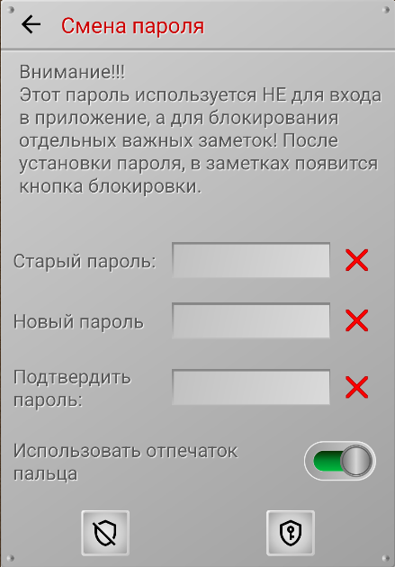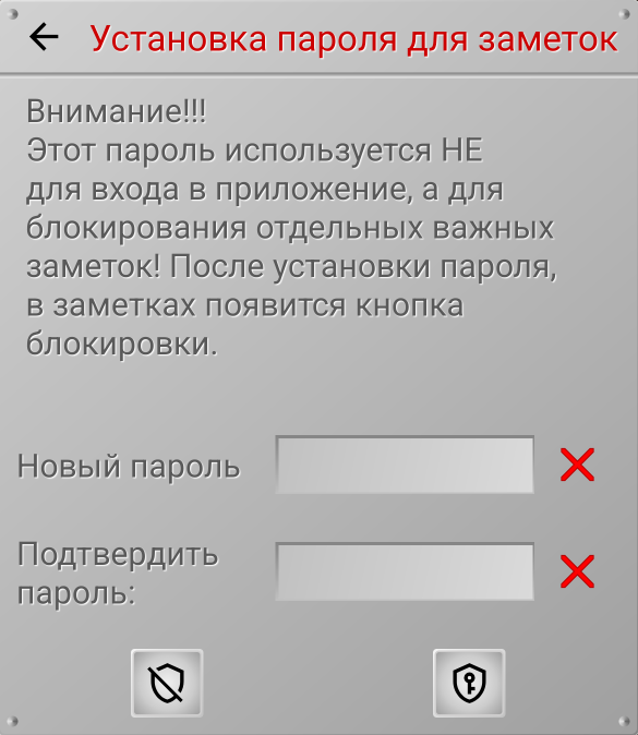 В этом разделе вы можете установить пароль, которым, впоследствии, сможете защищать отдельные заметки. Обратите внимание, что этот пароль используется не для входа в приложение, а именно для защиты отдельных заметок. Вы устанавливаете здесь единый пароль, и это избавляет вас от необходимости установки отдельных паролей для каждой заметки.