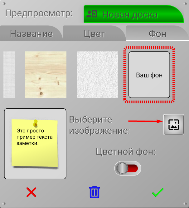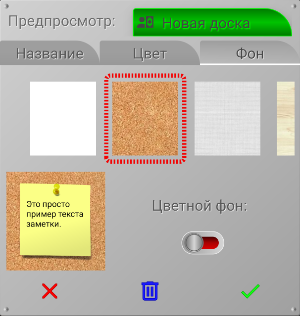 Если вас не устраивает пробковый фон досок, вы можете выбрать фон для каждой доски. В приложении предлагается несколько вариантов фона. Вы можете пролистывать эти варианты справа налево и выбрать наиболее подходящий. Выбранный вами фон, будет окружен красной рамкой.