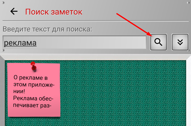 Введите в поисковую строку текст для поиска и нажмите кнопку поиска (с изображением увеличительного стекла). Например, мы ввели слово «реклама». Ниже, отобразятся все заметки, в которых встречается слово «реклама». Если вы откроете такую заметку, то увидите, что искомое слово будет выделено в тексте.