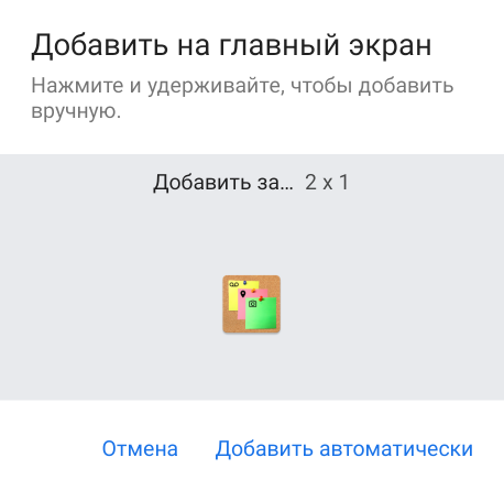 После того, как вы выберете пункт меню «Закрепить на домашнем экране», на экране появится предупреждение, что заметка будет сохранена и закрыта. Для подтверждения нажмите на зеленую галочку. После этого, вы увидите окно размещения виджета, которое будет выглядеть, примерно, так: