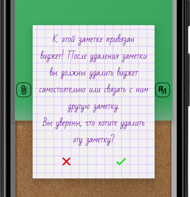 👉 При удалении заметки, к которой привязан виджет, сам виджет не удаляется, а просто остается на экране без заметки. Это особенность системы Андроид. Поэтому, вы увидите соответствующее предупреждение.