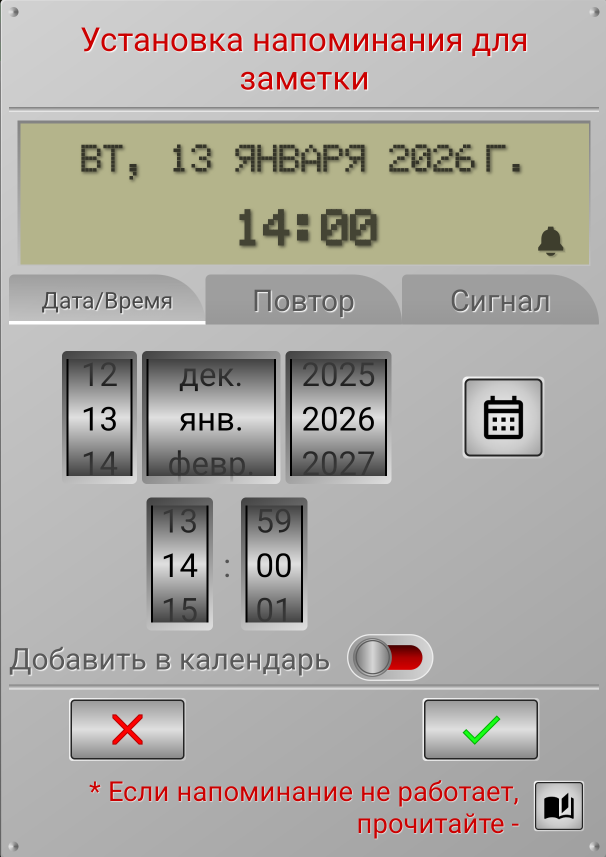 Установленные дата и время, отображаются на дисплее в верхней части окна. При выборе даты, вы можете воспользоваться календарем, нажав на кнопку справа от колесиков выбора даты. После этого, вы можете нажать на зеленую галочку, чтобы установить напоминание.
