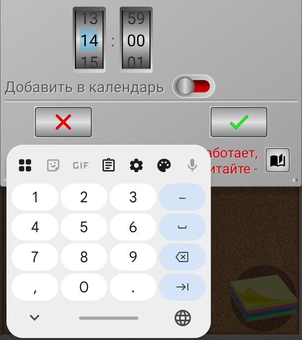 Обратите внимание, что дата и время напоминания должны быть установлены на будущее! Если выбранное время уже прошло, зеленая галочка будет неактивна, и вы не сможете ее нажать.