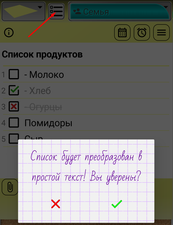 Если вы нажмете зеленую галочку, список будет преобразован в обычную текстовую заметку. Если вы хотите отказаться от этого и оставить контрольный список, нажмите красный крестик.