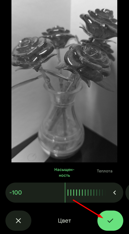 Редактировать – этот пункт меню появится у вас только в том случае, если на вашем телефоне установлено приложение Google Photos. Это приложение имеет достаточно большой набор инструментов для обработки и редактирования фото и видео. При выборе этого пункта меню, ваше фото откроется в Google Photos. Выполните необходимую обработку (например, преобразование фото в черно-белое), и нажмите кнопку с галочкой: