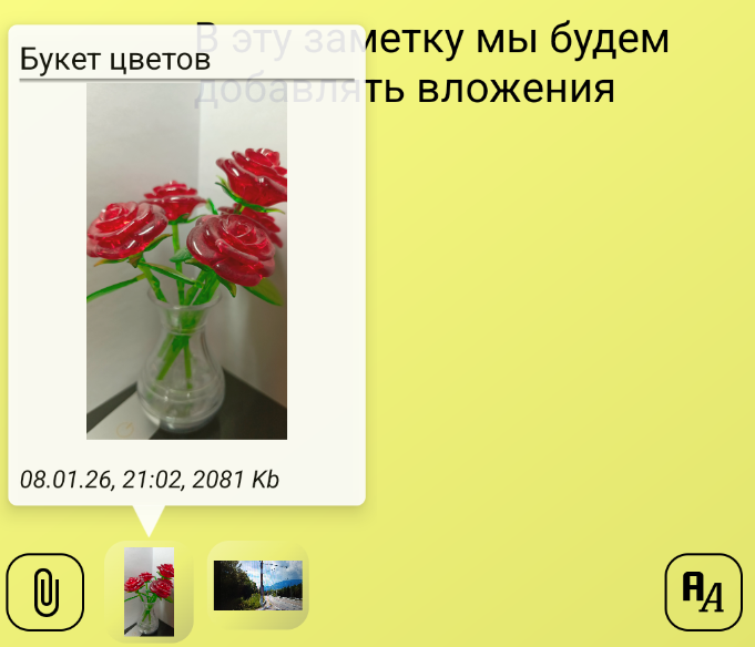 Вы можете нажать на миниатюру фото в заметке и немного подержать. Вы увидите всплывающее окно с изображением: