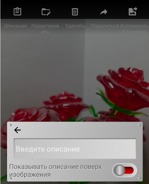 Введите описание в текстовое поле и нажмите стрелку назад, чтобы вернуться к вложению. Если вы хотите, чтобы описание показывалось поверх изображения при просмотре, включите опцию «Показывать описание поверх изображения». Выглядеть это будет так: