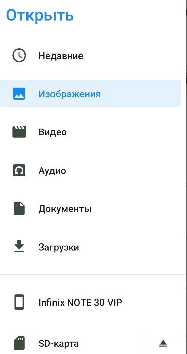 Этот пункт меню позволяет прикрепить к заметке любой файл, доступный на вашем телефоне. Это могут быть документы, электронные таблицы и т.п., а также, фото, видео и звуковые файлы, которые уже есть на вашем телефоне, например, в Галерее. При выборе этого пункта меню, скорее всего, откроется именно Галерея или то место хранения, которым вы пользовались в последний раз. Внешний вид окна для выбора файла, может меняться, в зависимости от модели телефона и версии Андроид. Но, в большинстве случаев, в левом верхнем углу вы увидите кнопку (≡), нажав на которую, вы увидите доступные места хранения файлов: